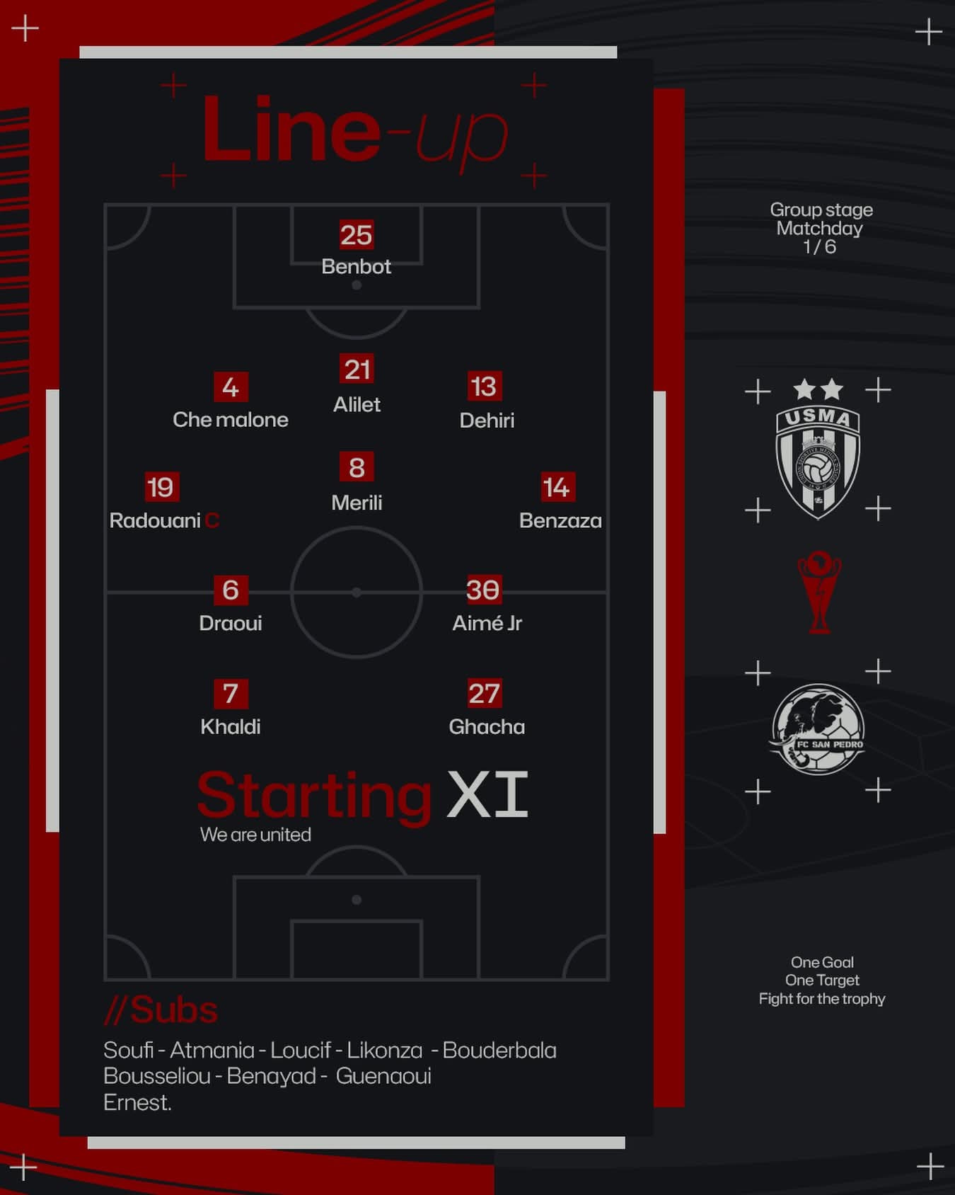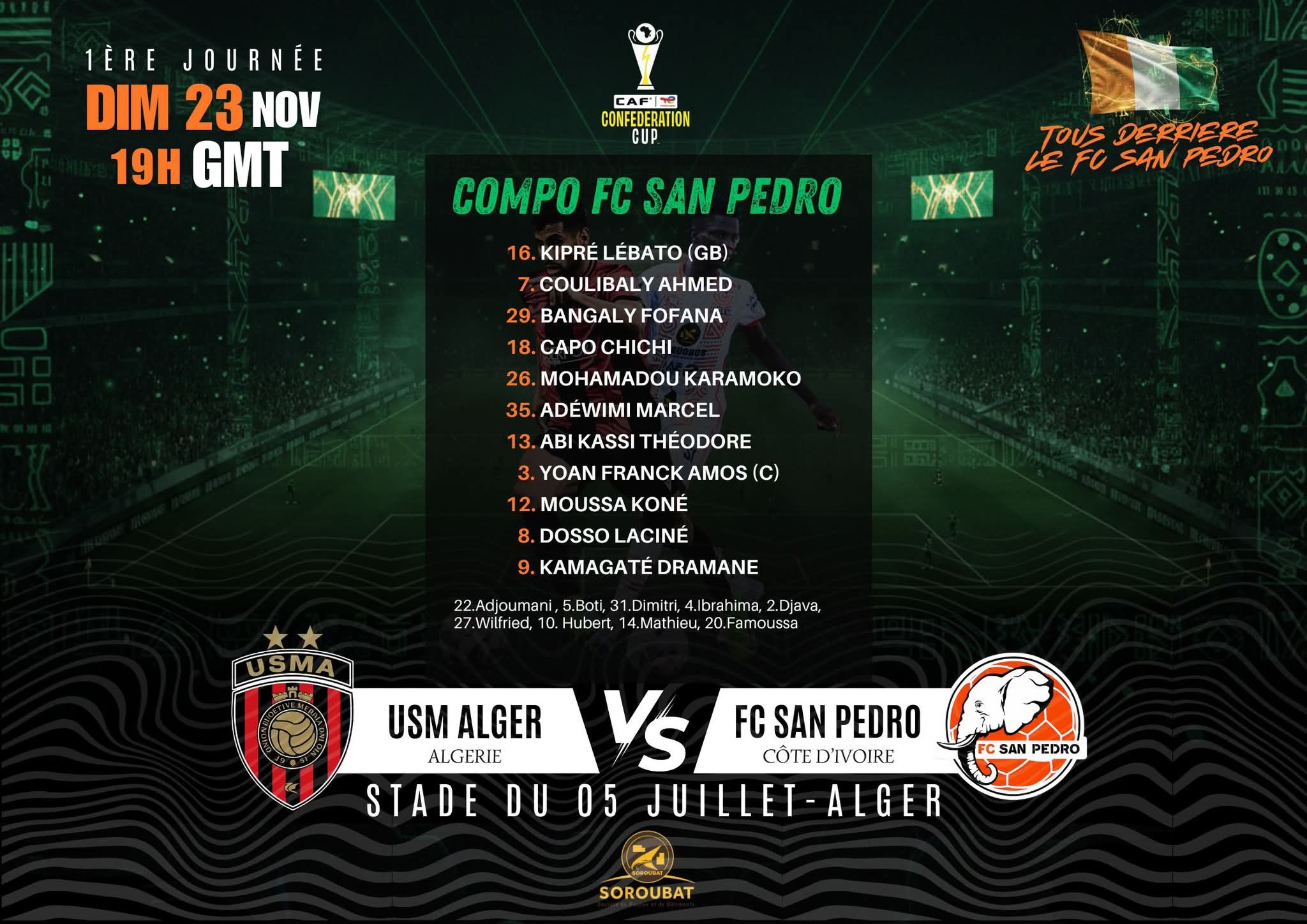 Découvrez les compositions officielles des deux pour le match de la Coupe CAF entre l'USM Alger et le FC San Pedro.