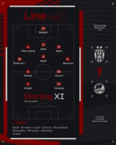 Titulaires 25. Benbot 4. Che Malone 21. Aillet 13. Dehiri 19. Radouani (capitaine) 8. Merili 14. Benzaza 6. Draoui 30. Aimé Jr 7. Khaldi 27. Ghacha