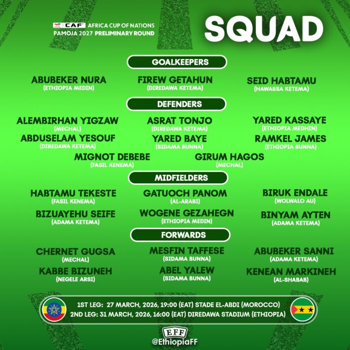 Le sélectionneur Yohannes Sahle a officiellement dévoilé sa liste de 23 joueurs pour affronter São Tomé-et-Príncipe dans le cadre des éliminatoires préliminaires de la CAN 2027.