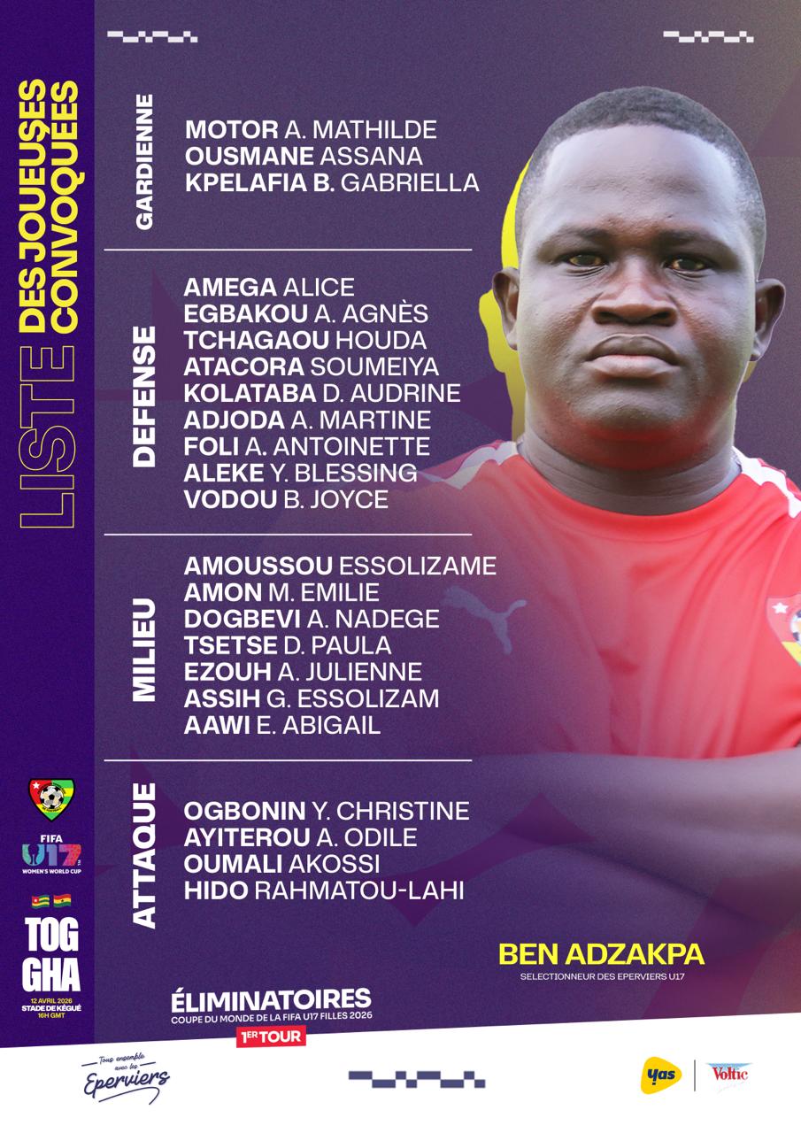 À quarante-huit heures du choc tant attendu contre le Ghana, le sélectionneur des Éperviers dames U17, Ben Adzakpa, a officiellement publié ce vendredi sa liste de joueuses convoquées.